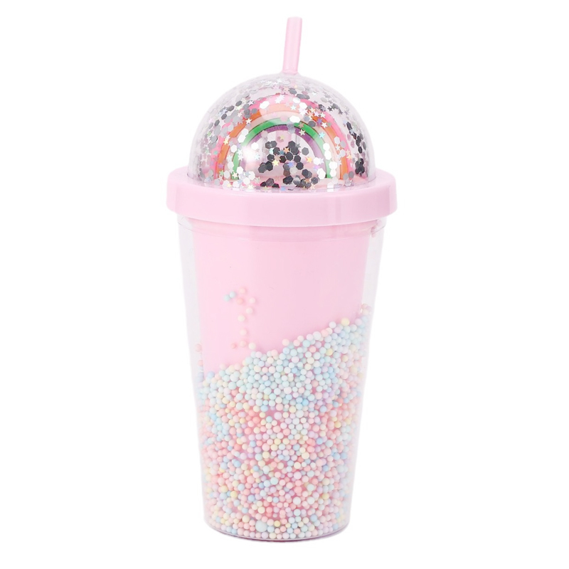 Tudung berkubah mencuri perhatian: pilih antara pelangi yang berkilauan (berputar dengan kilauan bintang) atau unicorn 3D kecil (terletak dalam manik pastel)—ia seperti membawa kisah dongeng mini ke mana-mana sahaja anda pergi. Dinding berkembar cawan dipenuhi dengan manik pastel terapung dan berkilauan, jadi ia berkilauan dengan setiap pergerakan (tiada kacau-bilau, hanya sihir!).